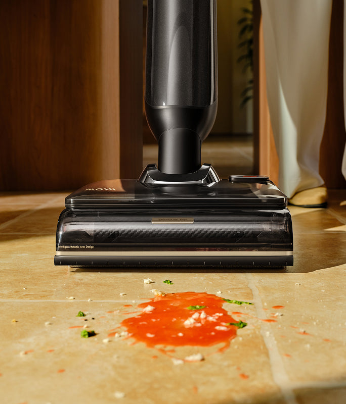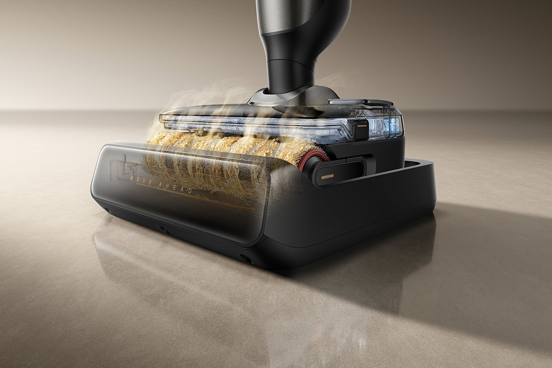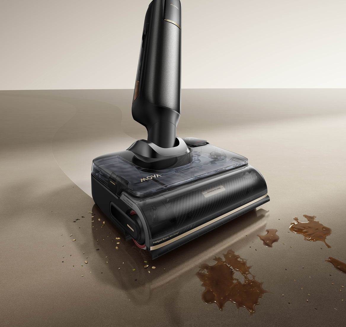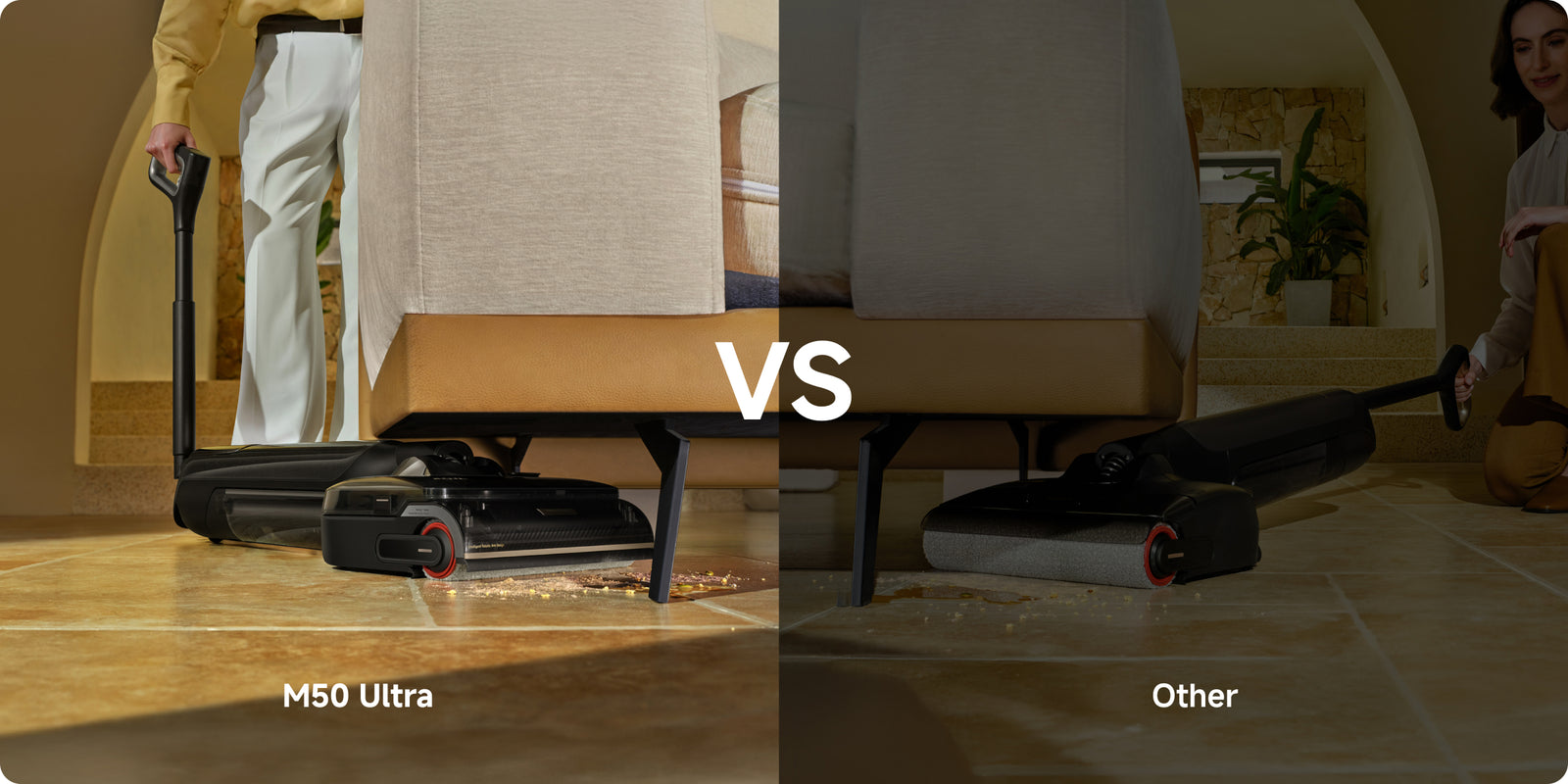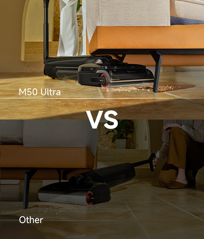 Con nuestra tecnología EdgeCoverage™ con IA, el M50 Ultra cuenta con un brazo robótico en la parte delantera de su cepillo de rodillo, que extiende activamente el raspador para llegar a los huecos a lo largo de la pared delantera y lograr así una auténtica limpieza de bordes con 0 huecos. Al tirar hacia atrás, el brazo robótico desciende rápidamente, rebañando el suelo mientras el aspirador en seco y húmedo elimina simultáneamente el agua residual, para no dejar casi ninguna mancha de agua.