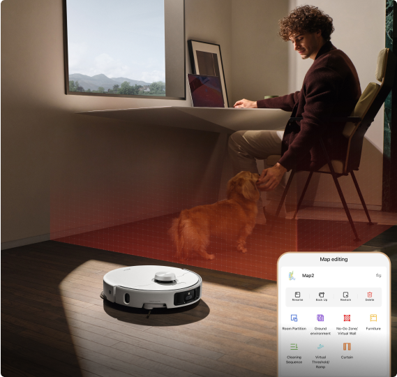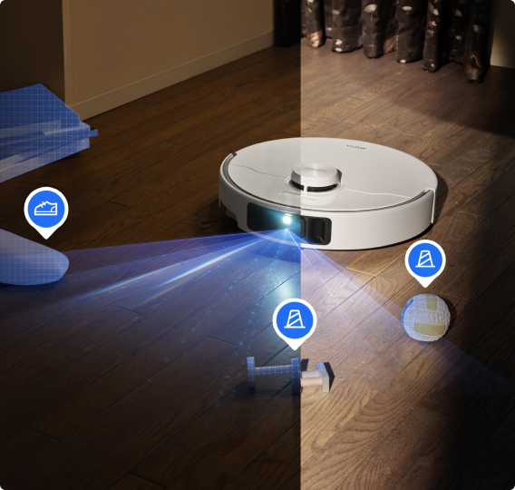 El robot P50 Ultra genera mapas 3D de 4 niveles y planifica rutas, navegando sin interrupciones por diversas superficies de la casa. Con la ayuda de los sensores y la luz estructurada 3D, el robot aspirador detecta y evita múltiples obstáculos, como zapatos, juguetes o patas de sillas.