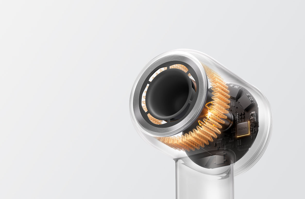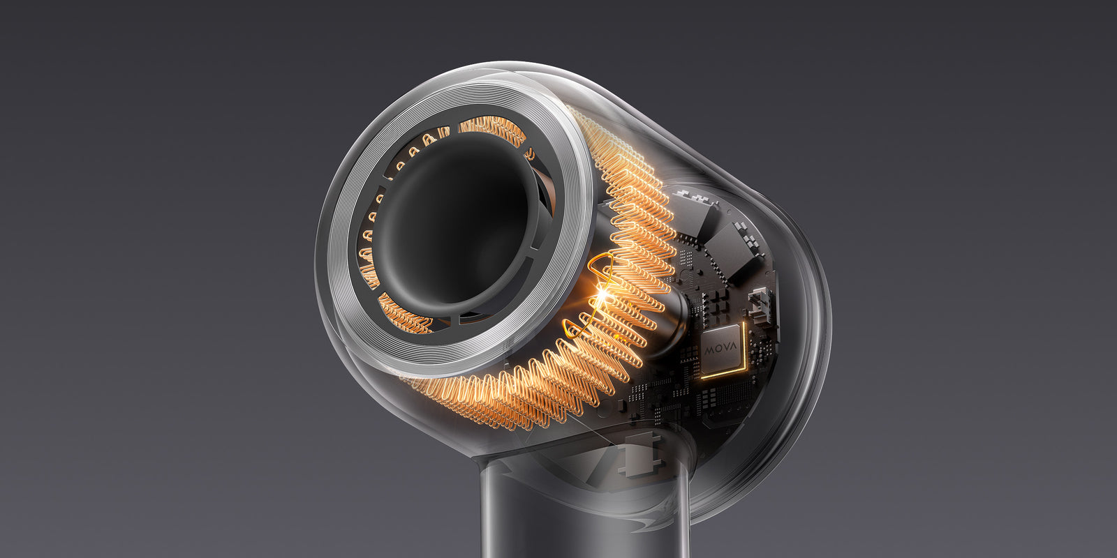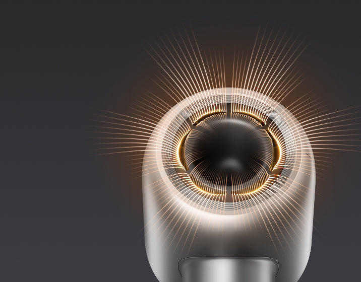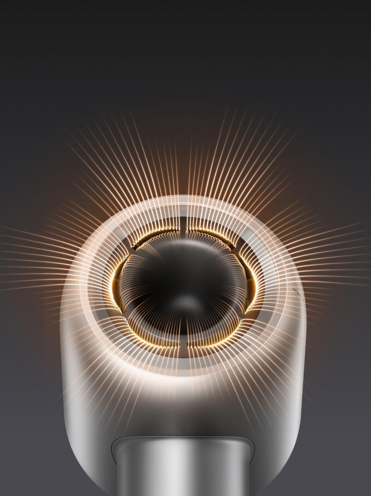 Shine 10 también cuenta con un potente motor de alta velocidad. Su motor sin escobillas de 110.000 rpm, combinado con las salidas de aire en forma de flor, proporciona una alta velocidad y un flujo de aire uniforme, capaz de soplar el cabello húmedo y pesado y llegar a las raíces. El potente flujo de aire a presión elimina rápidamente la humedad de la superficie del cuero cabelludo.