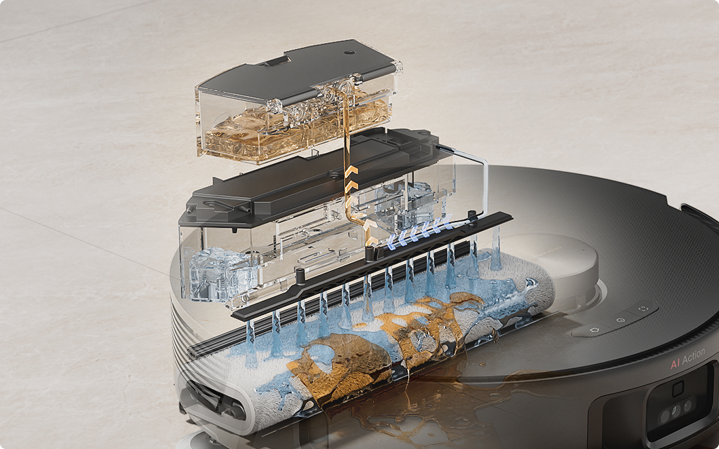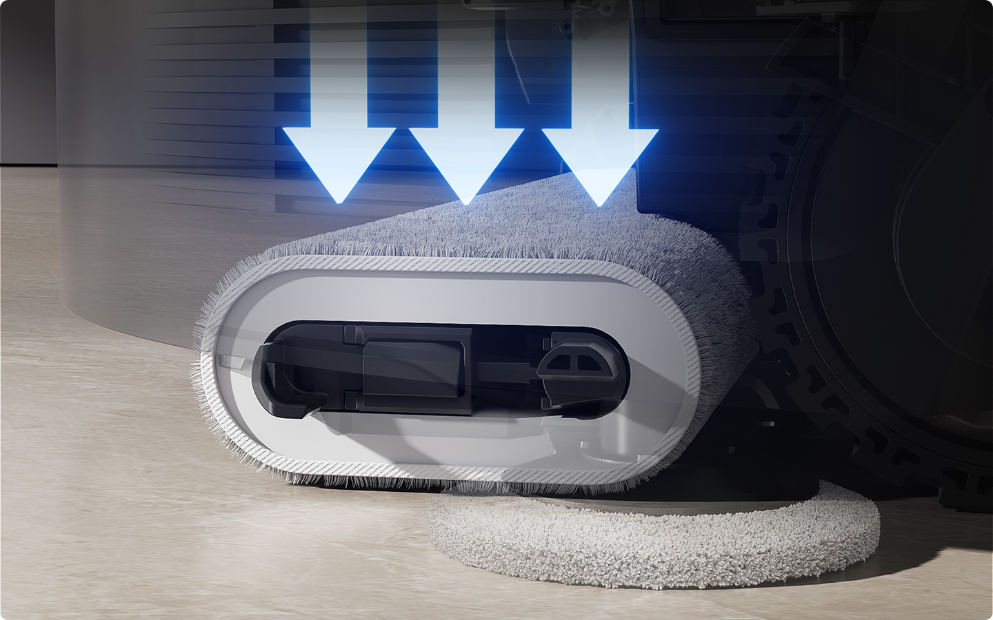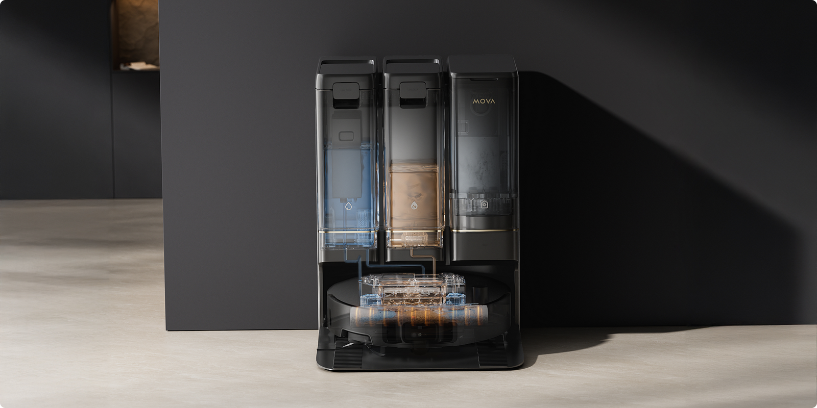 La solución de circulación de agua caliente del MOVA Z50 Ultra limpia de manera más inteligente con agua caliente que circula en tiempo real, manteniendo limpia la mopa giratoria, con el paño de mopa de una pieza que cubre un área mayor, para ofrecer una limpieza profunda con menos esfuerzo.
