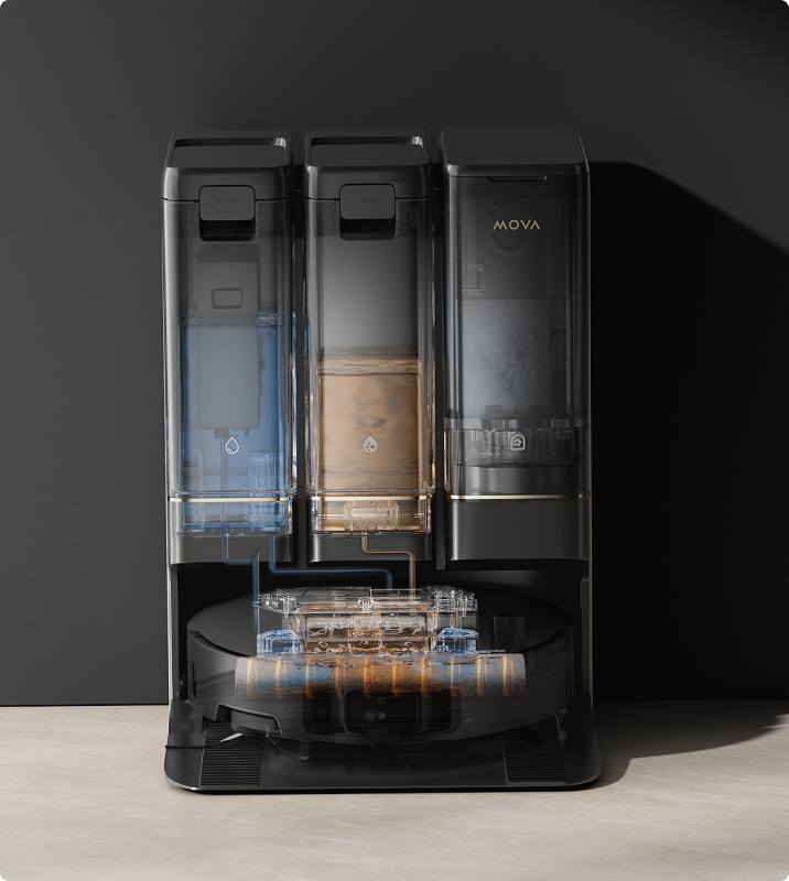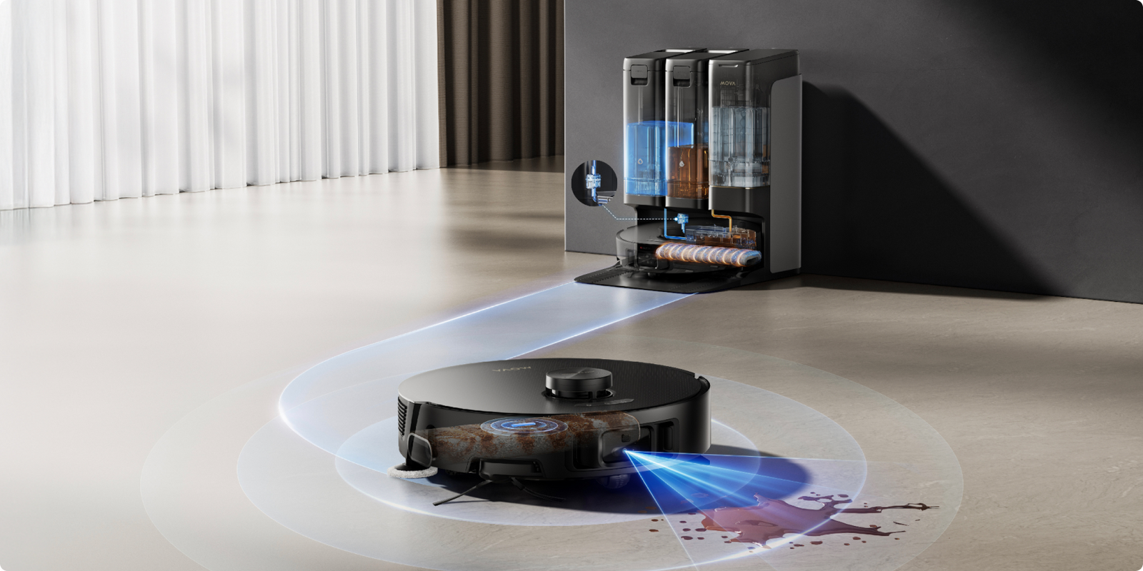 5. *"Innovación MOVA" Detección de suciedad múltiple en tiempo real: "Innovación MOVA" se refiere al uso combinado de la IA delantera, cámaras dobles RGB, sensor de color incorporado en la mopa y detección de turbidez multiespectral en la estación base para un reconocimiento inteligente.