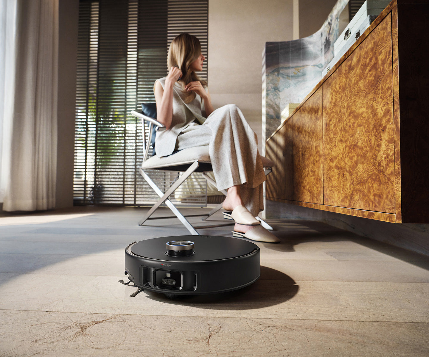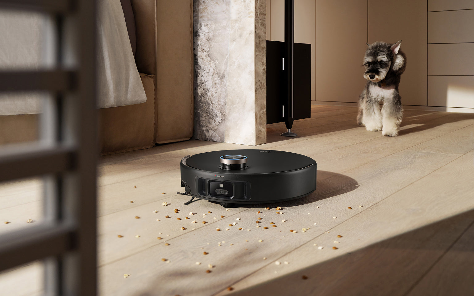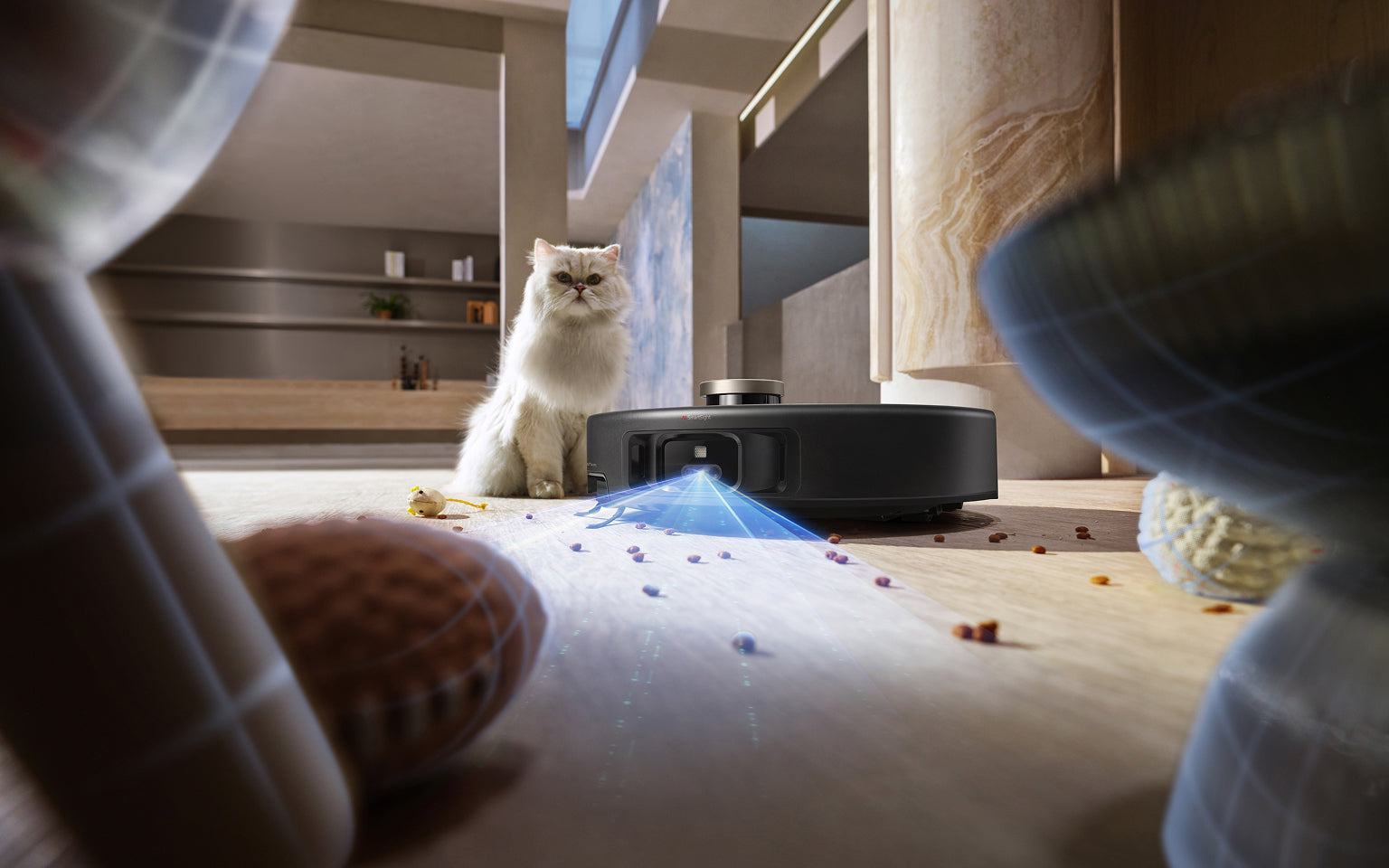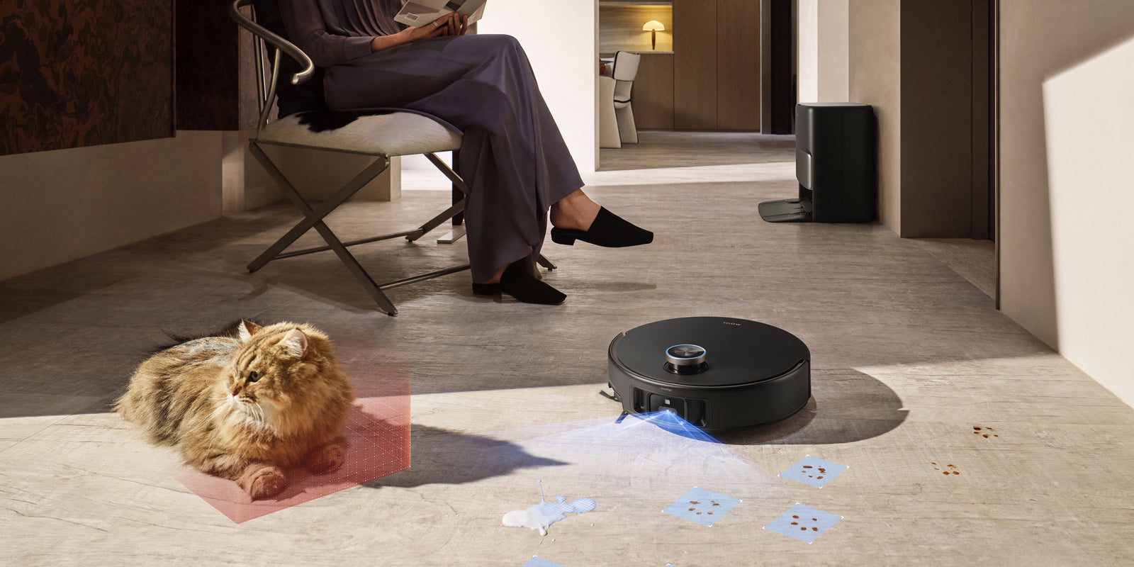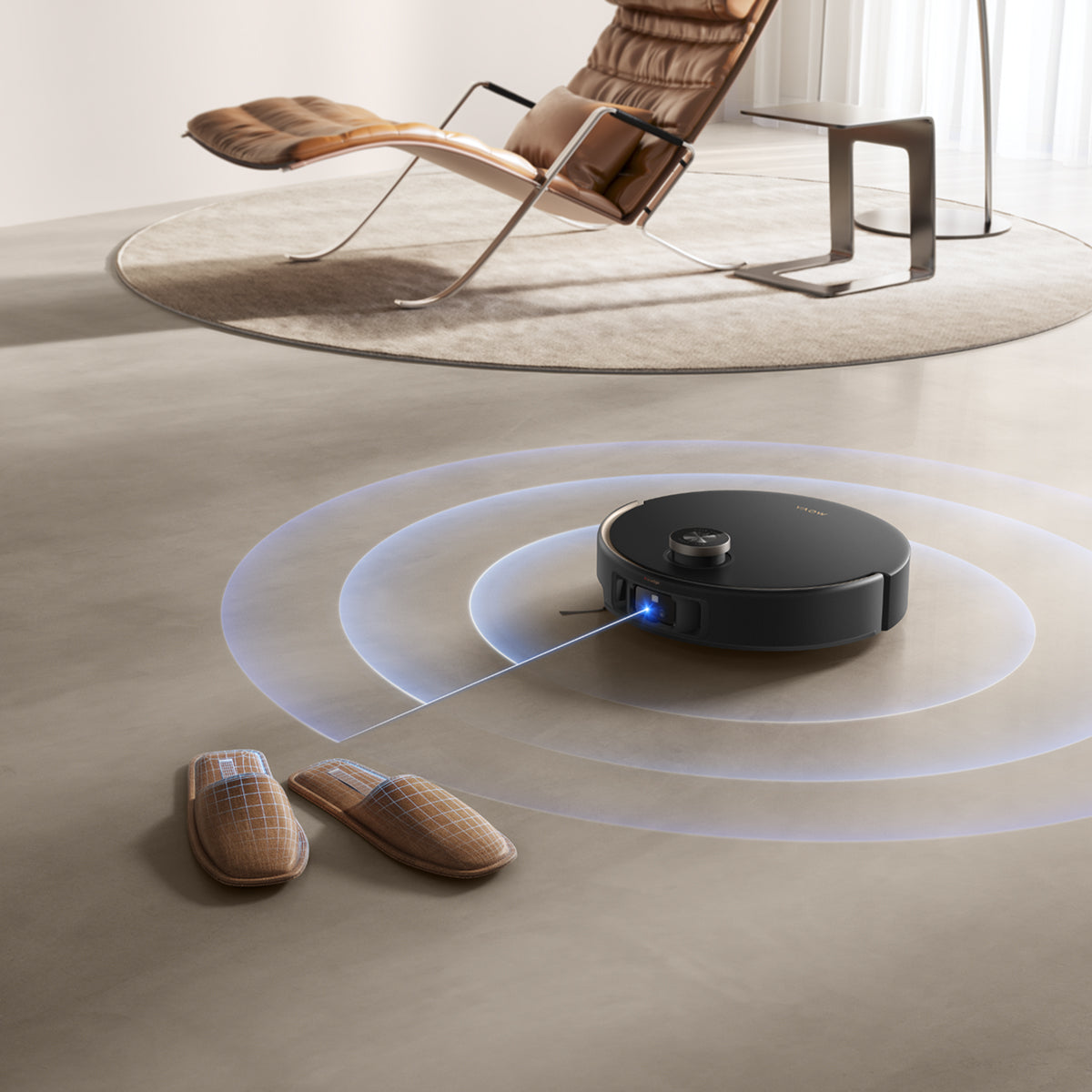 El sistema StepMaster™ cuenta con patas retráctiles robóticas que pueden levantar el chasis, lo que le permite cruzar fácilmente escalones, umbrales, rieles de puertas, patas de muebles en forma de U y pequeños obstáculos de hasta 6 cm* de altura. Navega por entornos domésticos complejos con facilidad para limpiar a fondo y regresar sin esfuerzo.